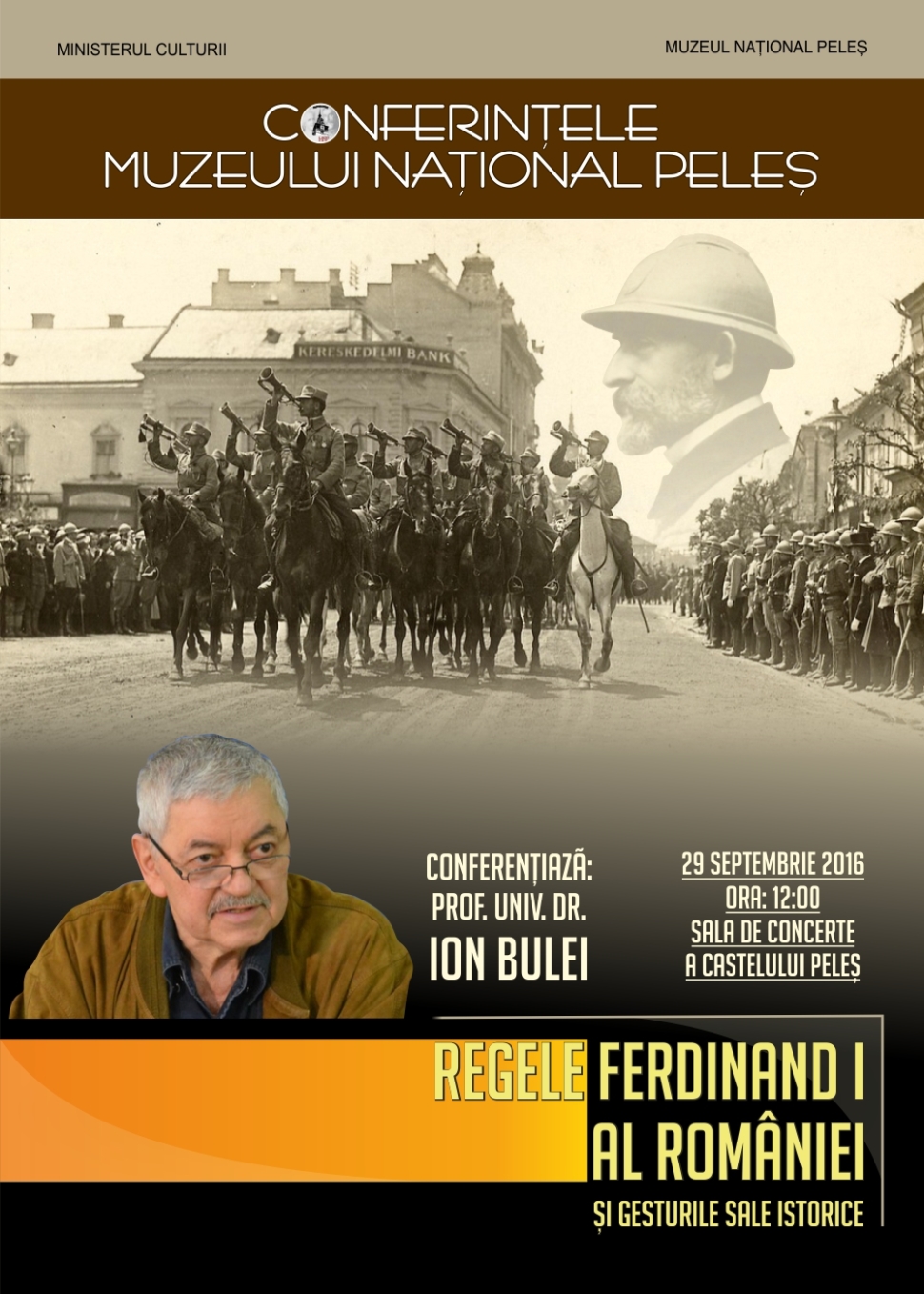 Muzeul Național Peleș vă invită joi, 29 septembrie, orele 12.00 să audiați conferința susținută de prof.univ. dr. Ion Bulei. Intitulată ,,Regele Ferdinand I al României și gesturile sale istorice“, ea se înscrie în seria conferințelor publice, dedicate regilor și reginelor României.