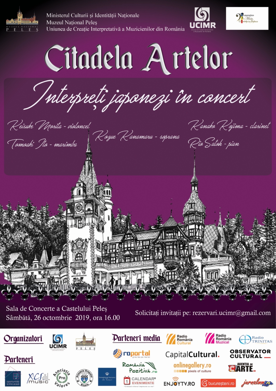 Stagiunea „Citadela Artelor” de la Sala de concerte a Castelului Peleș continuă sâmbătă, 26 octombrie, de la ora 16:00, cu invitați de excepție din Japonia, țara care a propulsat pe marile scene ale lumii numeroși interpreți de valoare internațională.