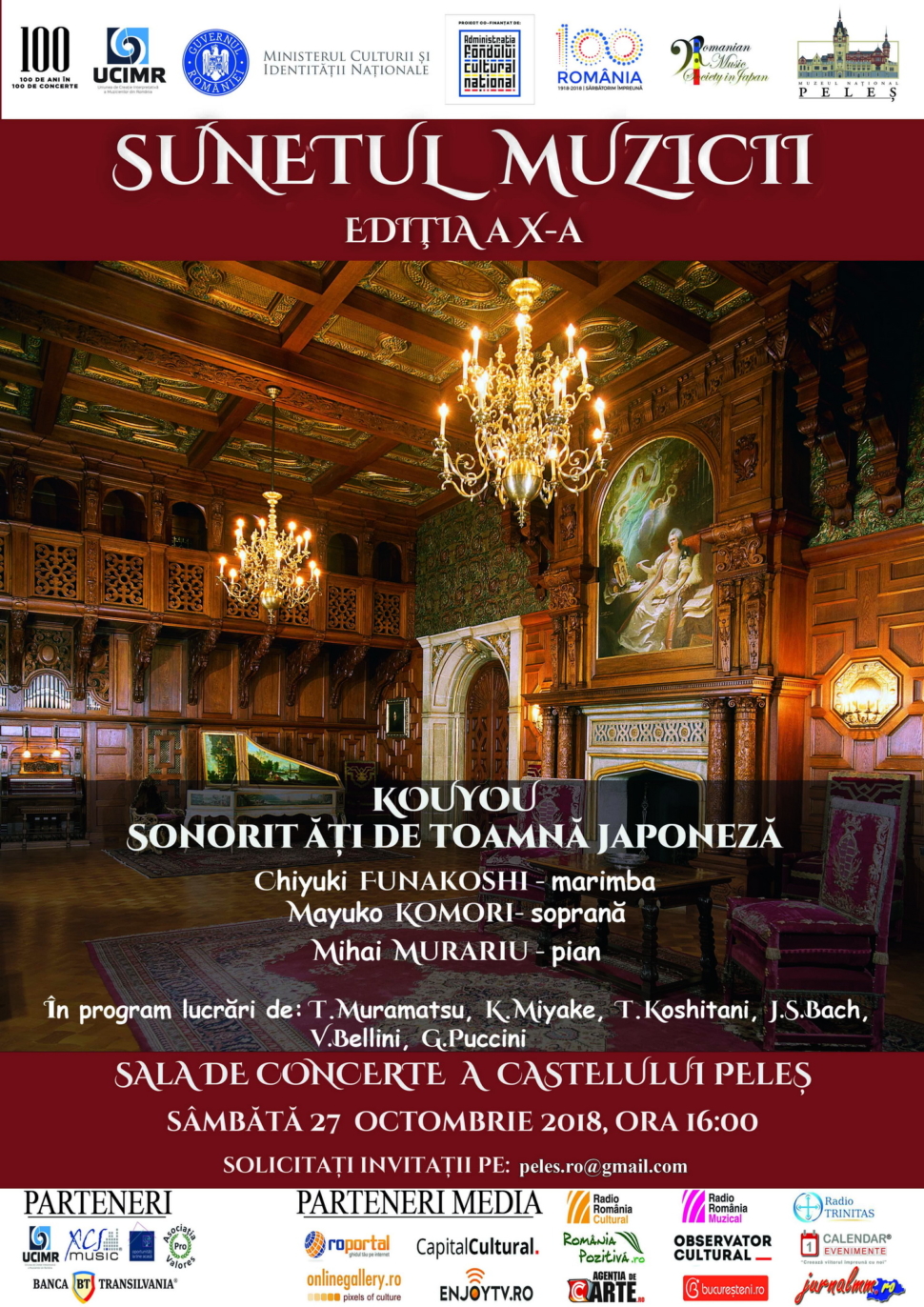 Sâmbătă 27 octombrie 2018, de la ora 16, laureații Concursului “România” de la Tokyo, organizat de Romanian Music Society in Japan, vor prezenta în fața iubitorilor artei sunetelor de la noi un program deosebit de spectaculos. Marimbafonista Chiyuki Funakoshi și soprana Mayuko Komori, în colaborare cu pianistul Mihai Murariu, vor interpreta atât opusuri ale creatorilor niponi, precum: Takatsugu Muramatsu, Kazunori Miyake, Tatsunosuke Koshitani, cât și lucrări semnate de titani ai muzicii europene: Johann Sebastian Bach, Vincenzo Bellini, Giacomo Puccini.