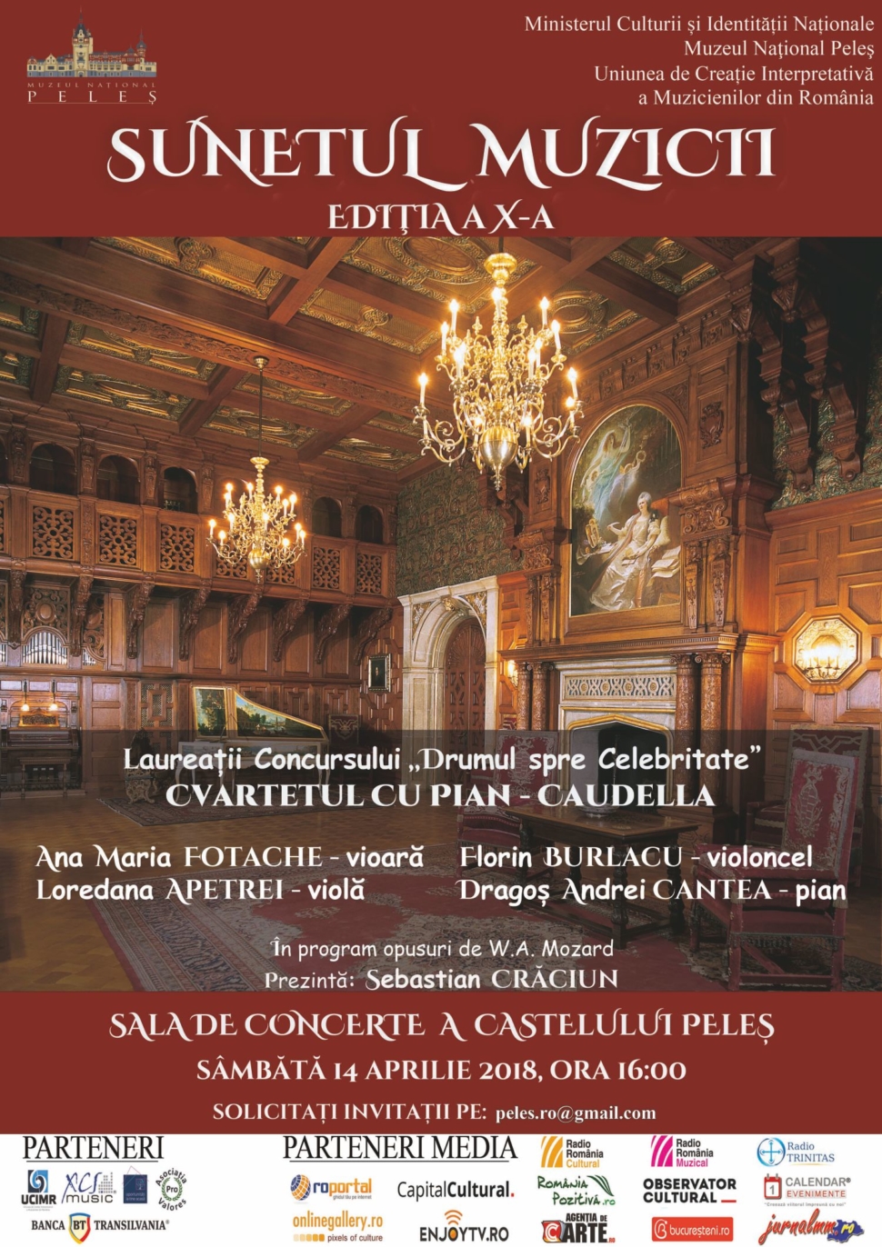 Stagiunea “Sunetul Muzicii” ediția a X-a de la Castelul Peleș, organizată de Muzeul Național Peleș și Uniunea de Creație Interpretativă a Muzicienilor din România, propune iubitorilor muzicii de calitate recitalul exceptional al Cvartetului cu pian “Caudella”.
