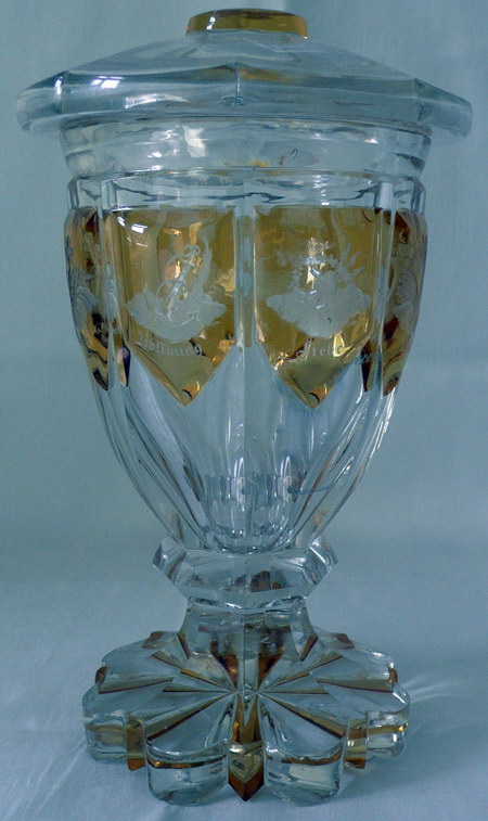 Piesa Egermann deţinută de Muzeul Naţional Peleş, şi anume „cupa de logodnă”, are inscripţie-dedicaţie în limba germană, din cristal, pe talpă polilobată, cu picior scurt, faţetat, corp bulbar având la partea superioară opt faţete pentagonale, pe care au fost aplicate picături de sticlă galbenă, care, după fuzionare cu sticla de bază şi lustruire, au fost gravate cu simboluri ale dragostei, păcii, sănătăţii.